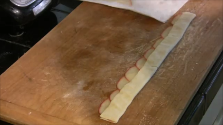 Pat the apple slices dry. Once you have done this place the slices onto the dough so that they overlap 50% and the rounded edges stick proud above the top edge.